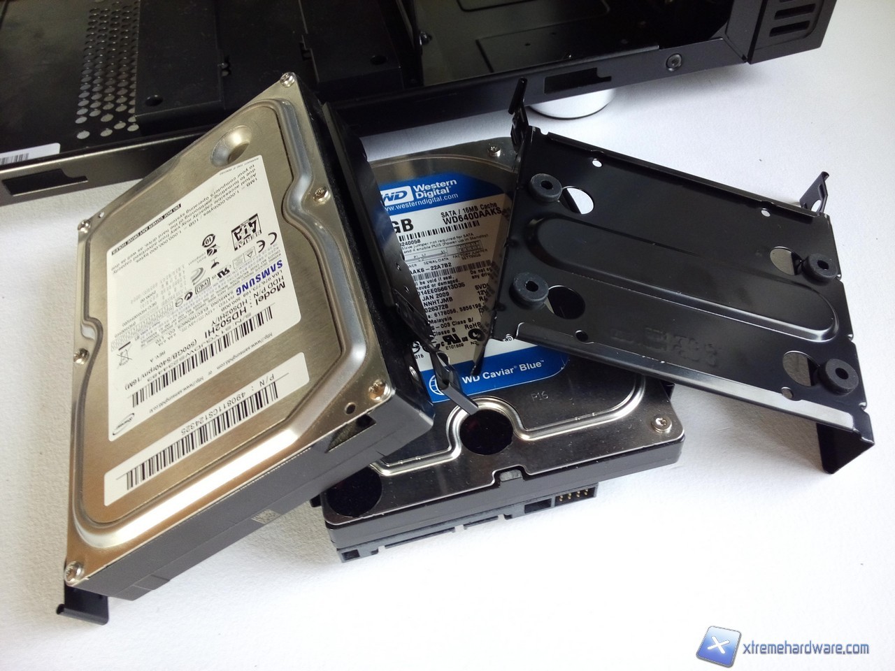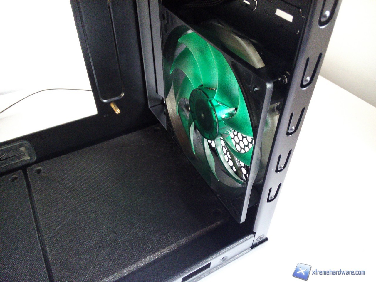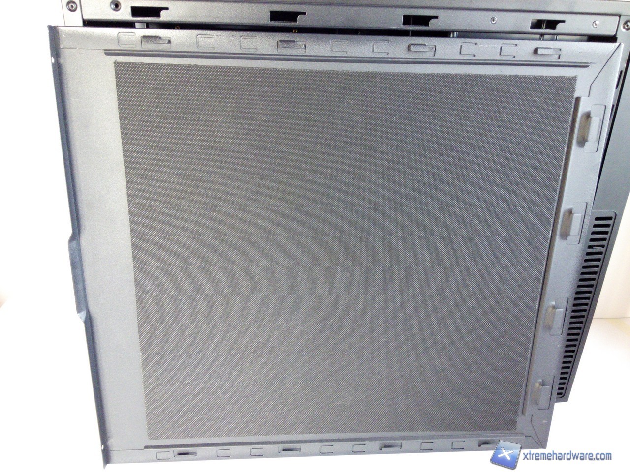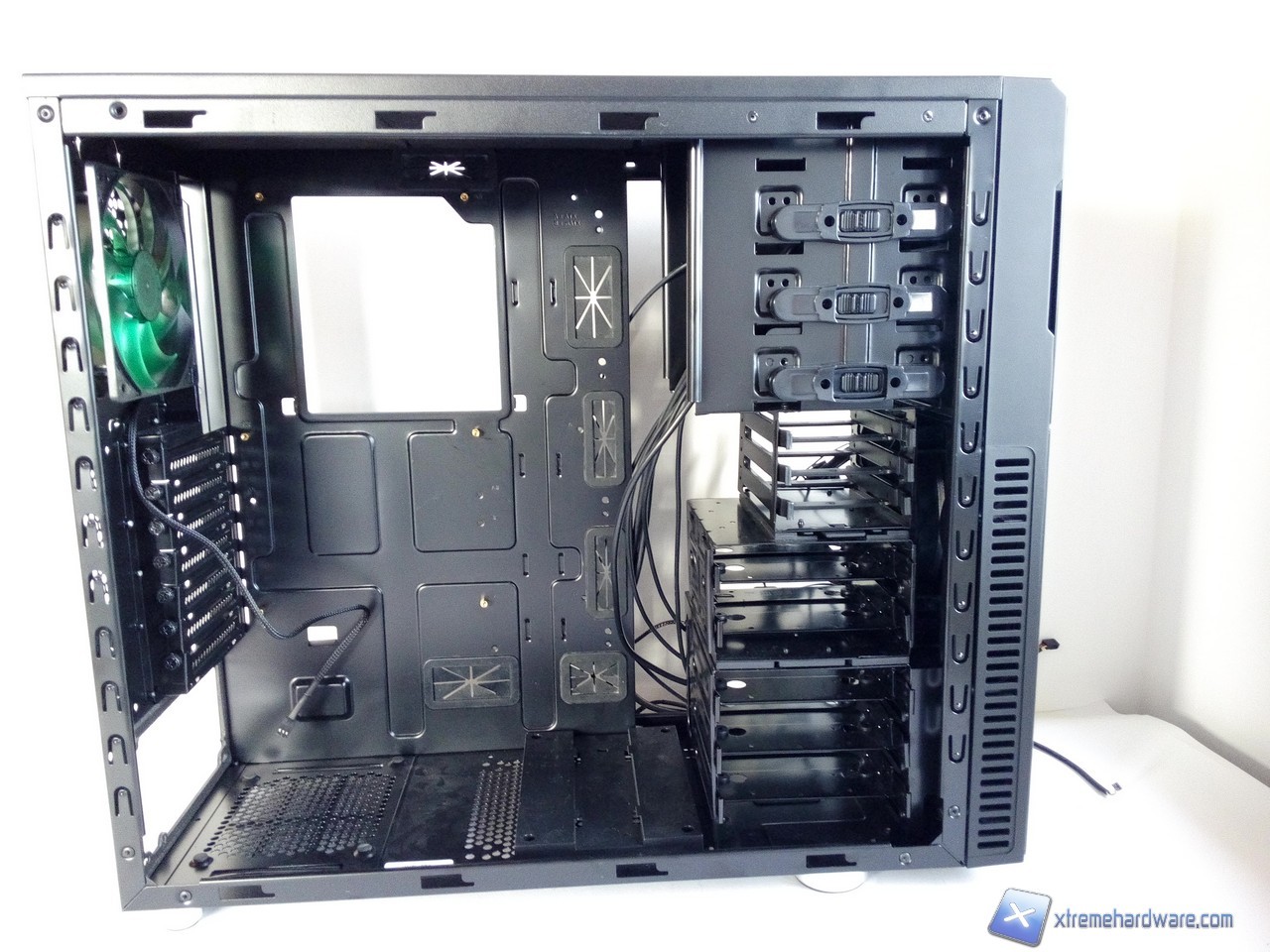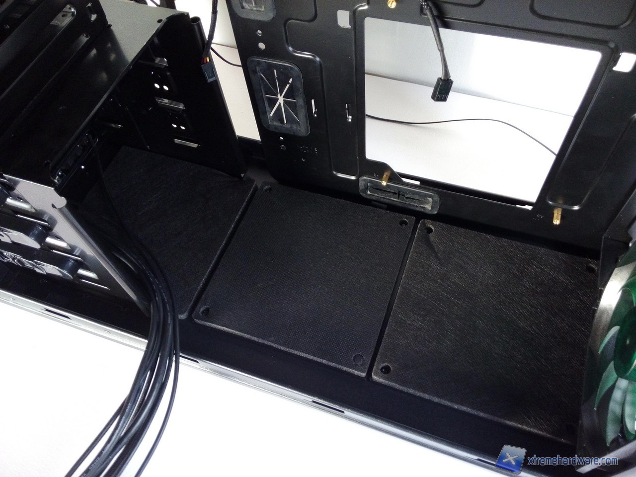 Visto l'esterno, passiamo all'interno di questo interessante case. Anche all'interno il look è total black, lo spazio è più che sufficiente per intervenire sull'hardware, e tutti i vari elementi del cabinet sono dimensionati a dovere. Molto comodi i bay per i dischi ottici e per gli hard disk che, per quanto riguarda i dispositivi da 5.25", sono assolutamente tool-less mentre per ciò che concerne gli hard disk o eventuali ssd sono composti da un frame in metallo e numerose slitte metalliche o plastiche dotate anche di gommini antivibrazione. Le slitte presentano poi i classici fori per ancorare, tramite viti e non con sistemi hot-swap, i dischi rigidi. I cage nella zona anteriore sono componibili, è possibile infatti rimuovere senza difficoltà gli slot "centrali" dedicati agli hard disks in modo da aumentare lo spazio a disposizione delle schede video e, tramite un cacciavite, possiamo anche svitare il frame che contiene le slitte per SSD o dischi da 2.5". La gabbia inferiore degli hard disk e quella dei dispositivi da 5.25" non sono invece rimovibili se non tramite un trapano utile ad eliminare i rivetti utilizzati. Per quanto riguarda gli hard disk è importante notare che a fianco dell'alimentatore, sul fondo, è stata inserita un'altra piastra in plastica per permettere agli utenti di installare due cage affiancati per un totale di cinque dischi da 3.5". Questa piastra è ovviamente rimovibile ed al suo posto è possibile inserire una ventola da 120mm per migliorare il flusso di aria fresca in entrata; ricordo ovviamente che tutte queste operazioni sono possibili a patto di non avere un alimentatore eccessivamente lungo come quelli modulari ad alti wattaggi (modulari da 1000w in su tipicamente).