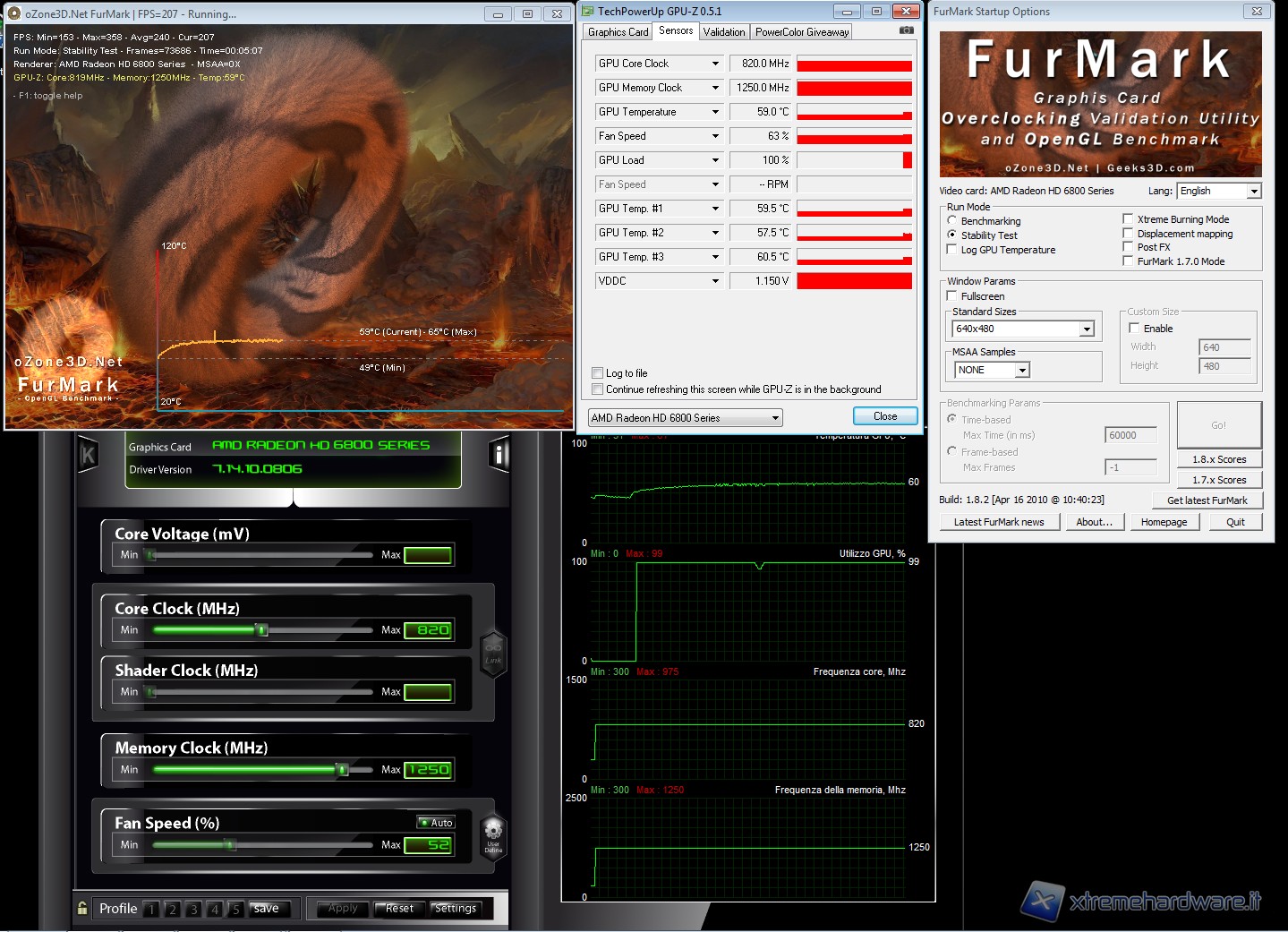 Non contenti dei risultati ottenuti tramite il CCC che come immaginavamo bloccava di fatto le potenzialità della scheda prodotta da Gigabyte, abbiamo pensato di usare un apposito tool normalmente usato per aumentare le frequenze di core e memorie. I risultati ottenuti sono davvero superlativi, abbiamo raggiunto una frequenza stabile per il core di ben 955 MHz. La scheda inoltre è riuscita a concludere benchmark a ben 975 MHz anche se ovviamente non in maniera stabile. Mentre le memorie le abbiamo settate tranquillamente a 1250 MHz come da specifica Hynix. Potete osservare questi risultati nelle immagini sottostanti (segnaliamo come gpu-z non rilevi correttamente il numero di rpm della ventola di raffreddamento):