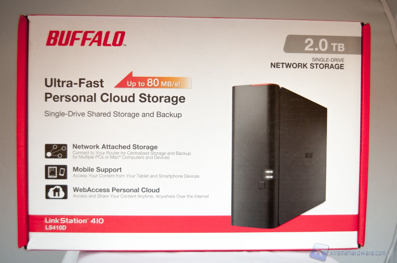 Il Buffalo LinkStation LS410D viene venduto all'interno di una scatola in cartone bianca e rossa riportante numerose informazioni riguardanti il prodotto.